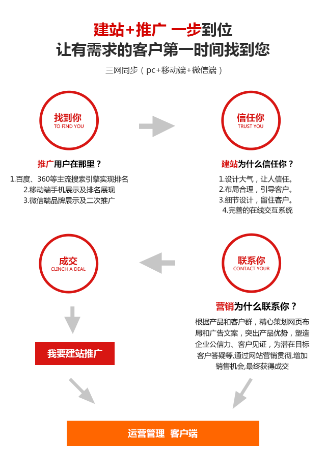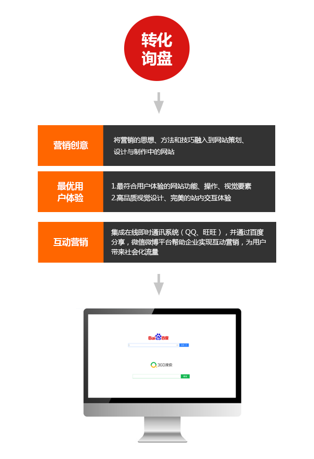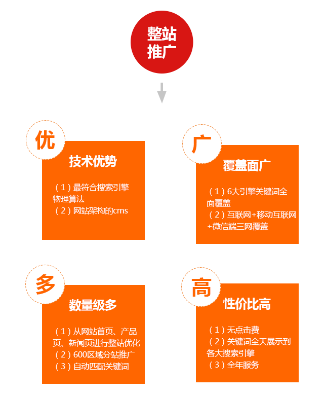程序优化 : 拥有最领先的搜索引擎技术架构,整合百度、360、谷歌、搜搜等国内外主流搜索引擎的优化特点,让企业通过互联网平台,快速高效的展示在客户面前,提升销售业绩和品牌影响力。