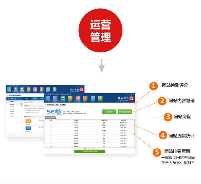 客服端服务系统,可一键对网站进行安全监测、内容管理、流量分析、排名查询。